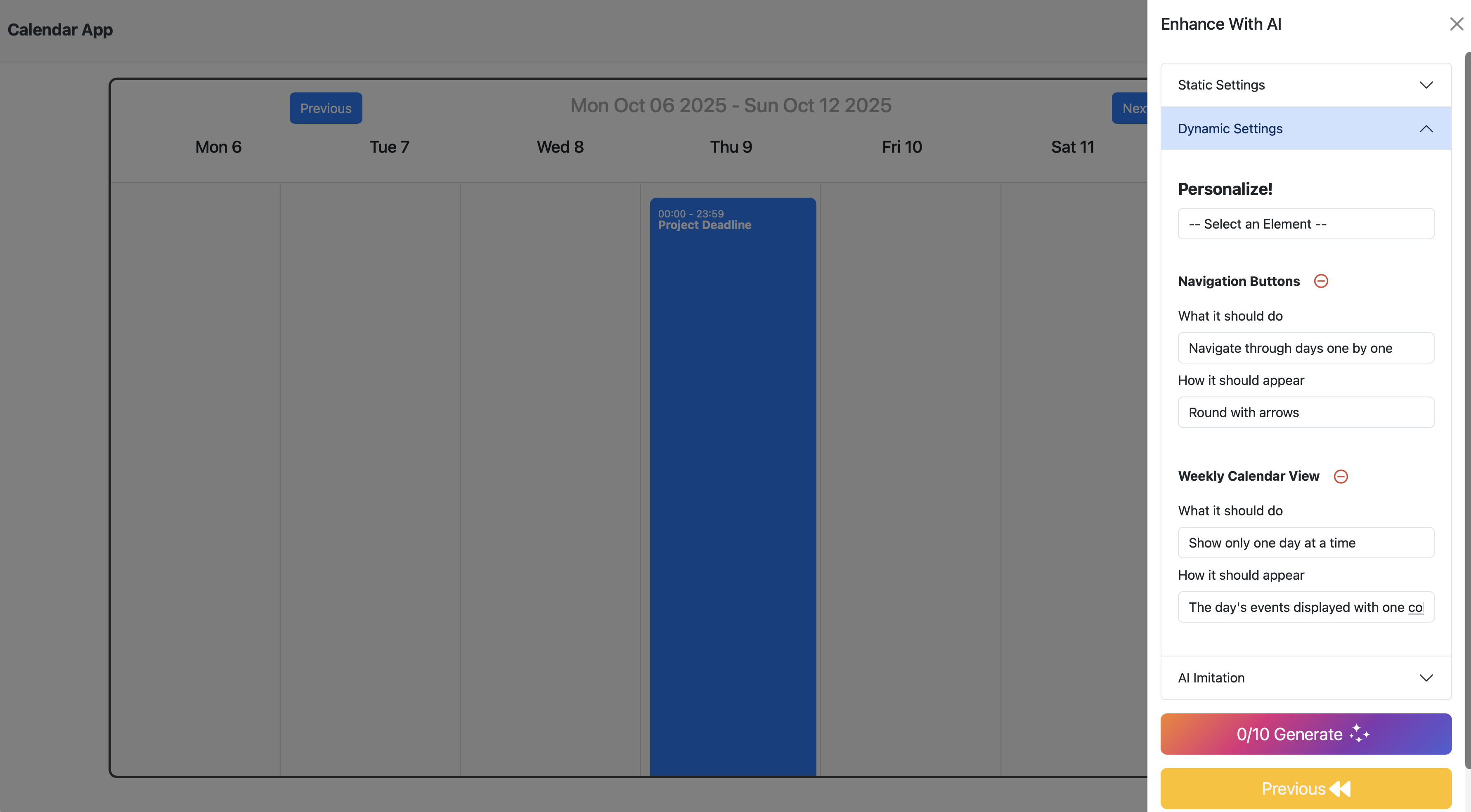 The "Enhance With AI" panel in MorphGUI enables users to personalize and modify their interface through AI-assisted customization. It features two main sections, Static Settings and Dynamic Settings, allowing configuration of both fixed and adaptive interface components. Within the Dynamic Settings tab, the Personalize section introduces component-level targeting for modifying or adding UI elements. Users specify What it should do to define the element's functional behavior and How it should appear to control its styling and layout. The panel also provides three main actions: Generate to apply the defined changes, Previous to roll back to a previous configuration, and Restore to return the interface to its last stable state.