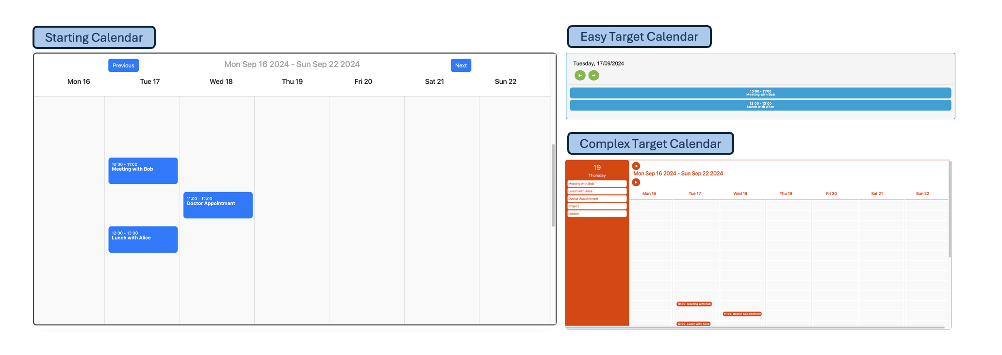 The user study evaluated MorphGUI in terms of usability, learning curve, and interaction effectiveness when customizing graphical interfaces through natural language. Participants performed a series of interface modification tasks using a calendar application. Each participant started with base calendar layout and used MorphGUI to reproduce one or more target interfaces of increasing complexity. The easy task involved straightforward visual or structural edits (e.g., changing colors, repositioning elements), while the complex task required functional and aesthetic modifications, such as adding components, reorganizing layouts, or combining multiple requests into a single prompt.