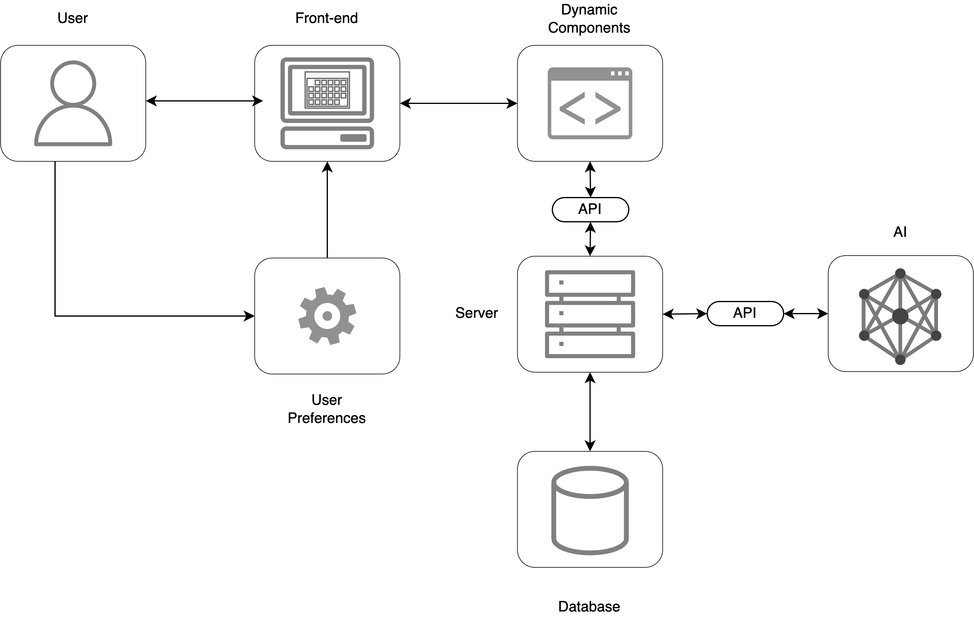 The system architecture implements a modular client-server model that enables real-time GUI customization through natural language interaction. The Front-end is a web-based interface built on a component-driven framework that communicates bidirectionally with Dynamic Components for runtime rendering and update of interface elements. These components interface with the Server layer via RESTful APIs to support synchronous data exchange and asynchronous updates. The Server, developed using Node.js and the Express.js framework, orchestrates communication with the AI module,a large language model that parses natural language inputs and translates them into executable interface specifications. The Database layer, implemented with SQLite, manages persistent storage of user preferences, interface states, and component configurations, enabling rollback and version control functionalities. The User Preferences subsystem provides contextual adaptation by maintaining individualized configuration data that influence interface behavior and visual presentation across sessions.